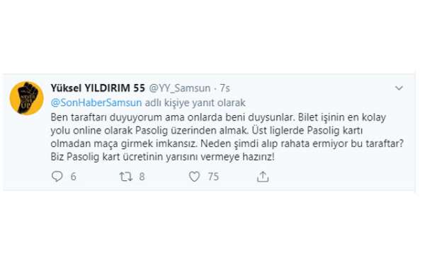 YılPort Samsunspor İcra Kurulu Başkanı Yüksel Yıldırım da bu çağrılara sessiz kalmayarak; “Ben taraftarı duyuyorum ama onlarda beni duysunlar. Bilet işinin en kolay yolu online olarak Pasolig üzerinden almak. Üst liglerde Pasolig kartı olmadan maça girmek imkansız. Neden şimdi alıp rahata ermiyor bu taraftar? Biz Pasolig kart ücretinin yarısını vermeye hazırız” dedi.