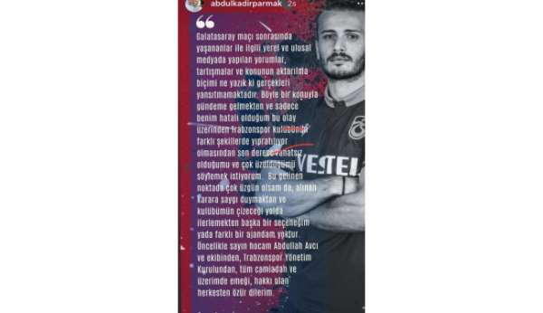 Trabzonspor Teknik Direktörü Abdullah Avcı tarafından disiplinsiz hareketlerinden ötürü kadro dışı bırakılan Abdulkadir Parmak özür diledi.