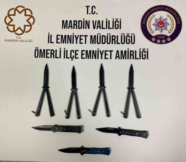 İl Emniyet Müdürlüğünden yapılan açıklamada, Ömerli İlçe Emniyet Amirliği ekiplerince ilçe genelinde düzenlenen uygulamalarda, seyyar satış yapan bir kişinin sattığı ürünler arasında 4 adet kelebek ve 3 adet sustalı bıçak bulundu. Bıçaklara el konulurken şahıs hakkında, 6136 sayılı kanun kapsamında adli işlem başlatıldı.