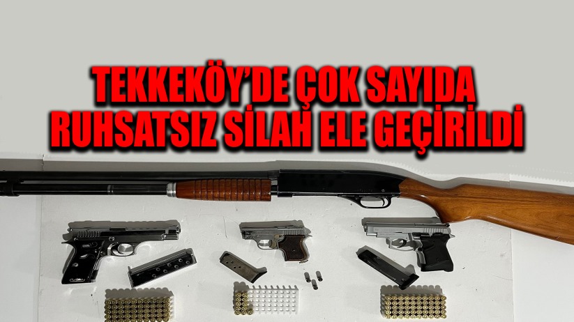 Tekkeköy İlçe Emniyet Müdürlüğü ekipleri tarafından yürütülen çalışmalar kapsamında bir şahsın üzerinde arama yapıldı. Yapılan aramalarda 1 adet 6.35 mm çapında ruhsatsız tabanca, tabancaya ait 1 adet şarjör ve 3 adet fişek, 1 adet 9.19 mm çapında ruhsatsız tabanca, tabancaya ait 1 adet boş şarjör ve 111 adet fişek, 1 adet ruhsatsız pompalı tüfek ile 1 adet kurusıkı tabanca ve tabancaya ait boş şarjör ele geçirildi. Olayla ilgili şüpheli şahıs gözaltına alınırken, hakkında adli işlem başlatıldı.