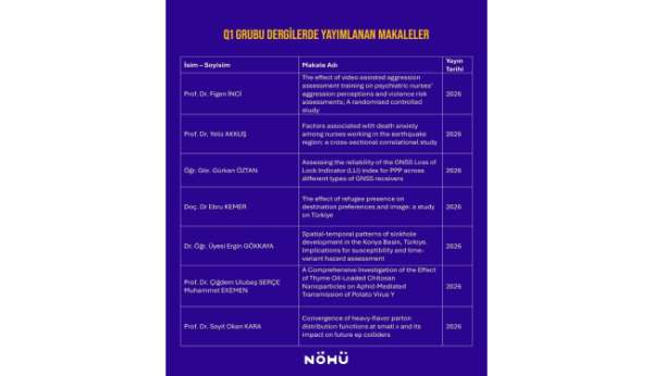 Üniversite akademisyenlerinin Ocak 2026 döneminde toplam 14 makalesi, Q1 kategorisindeki uluslararası dergilerde yayımlandı. Bilimsel etki düzeyi ve atıf performansı bakımından alanlarının en seçkin yayın organları arasında gösterilen Q1 sınıfındaki dergilerde yayımlanan çalışmalar, araştırma kalitesinin ve uluslararası akademik görünürlüğün önemli bir göstergesi olarak kabul ediliyor. Niğde Ömer Halisdemir Üniversitesi, yüksek etki değerine sahip uluslararası dergilerde yayın üretimini artırmayı, akademik iş birliklerini güçlendirmeyi ve bilimsel araştırma altyapısını geliştirmeyi sürdürüyor.