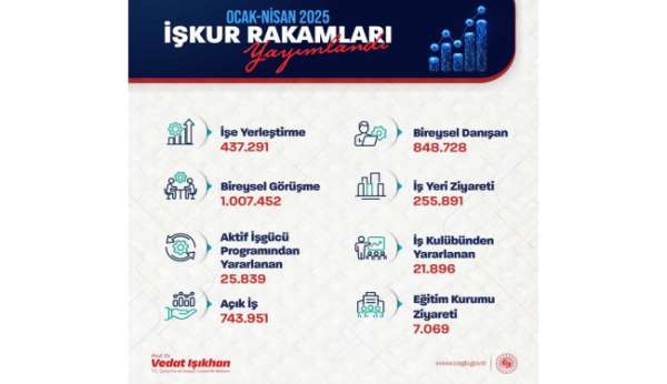 Çalışma ve Sosyal Güvenlik Bakanı Vedat Işıkhan, 'İŞKUR aracılığıyla ocak-nisan aylarında toplam 437 bin 291 işe yerleştirmeye aracılık ettik. 1 milyonun üzerinde bireysel görüşme ve 255 bin 891 iş yeri ziyareti gerçekleştirdik' dedi.