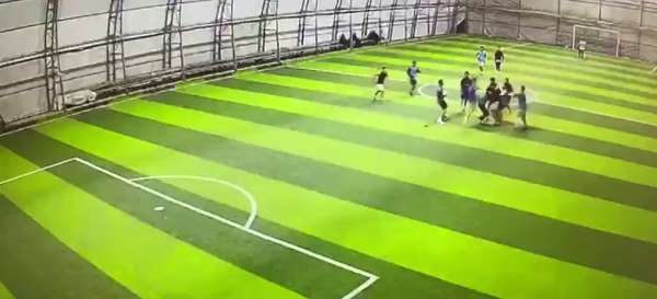 Kavga anı ise halı sahanın güvenlik kamerasına saniye saniye yansıdı. Görüntülerde 2 kişinin tartışması sonrasında da meydana gelen tekme tokatlı kavga yer alıyor.