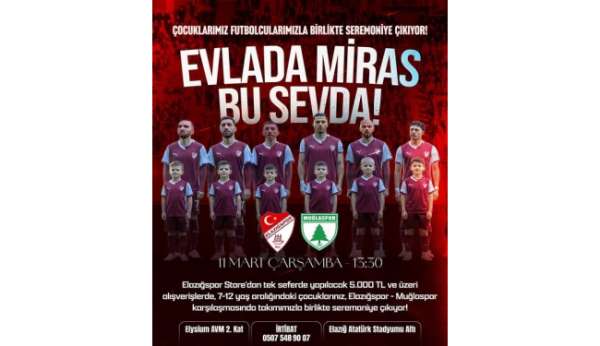 Elazığspor Kulübü'nden 'Bir sevda nesilden nesile' başlığıyla yapılan paylaşımda; '11 Mart Çarşamba günü oynayacağımız Muğlaspor karşılaşmasında çocuklarımız, futbolcularımızla birlikte seremoniye çıkıyor. Elazığspor Store'dan tek seferde yapılacak 5.000 TL ve üzeri alışverişlerde, 7-12 yaş aralığındaki evlatlarımız bu özel anı sahada yaşayacak. Bir çocuğun elinden tutup o çimlere adım atmak işte miras dediğimiz tam olarak bu' ifadeleri kullanıldı.