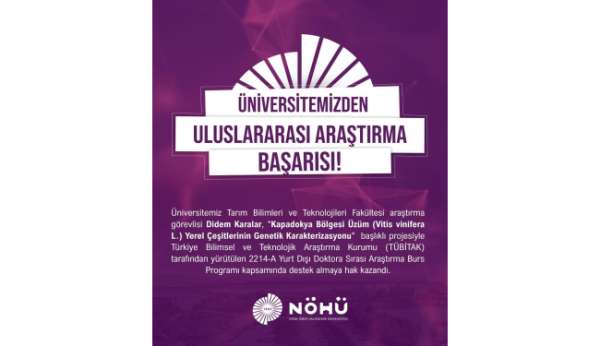 Niğde Ömer Halisdemir Üniversitesi Tarım Bilimleri ve Teknolojileri Fakültesi Araştırma Görevlisi Didem Karalar, 'Kapadokya Bölgesi Üzüm (Vitis vinifera L.) Yerel Çeşitlerinin Genetik Karakterizasyonu' başlıklı projesiyle Türkiye Bilimsel ve Teknolojik Araştırma Kurumu (TÜBİTAK) tarafından yürütülen 2214-A Yurt Dışı Doktora Sırası Araştırma Burs P