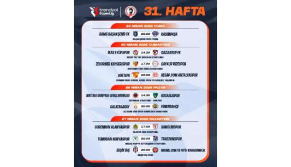 Trendyol Süper Lig'de 29, 30 ve 31. haftada oynanacak maçların programı açıklandı. Türkiye Futbol Federasyonu'nun internet sitesinden duyurulan programa göre, 31. haftadaki Galatasaray - Fenerbahçe derbisi 26 Nisan Pazar günü saat 20.00'de yapılacak.