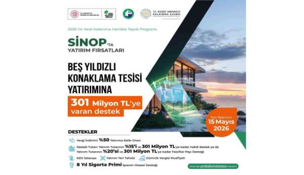 Sanayi ve Teknoloji Bakanlığı koordinasyonunda yürütülen '2026 Yılı Yerel Kalkınma Hamlesi Teşvik Programı' kapsamında, Sinop'ta gerçekleştirilecek beş yıldızlı konaklama tesisi yatırımlarına 301 milyon TL'ye varan dev destek sağlanacağı duyuruldu.