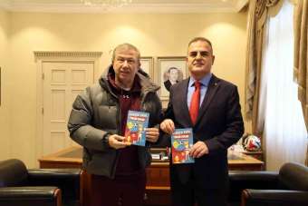 Futbolun efsane ismi Vali Akbıyık'a 'Gerçek Kral Tanju Çolak' kitabını hediye etti