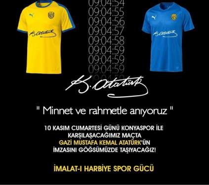 Spor Toto Süper Lig'in 12. haftasında yarın oynanacak olan Atiker Konyaspor - MKE Ankaragücü karşılaşmasında Türkiye Cumhuriyeti'nin kurucusu Mustafa Kemal Atatürk'ün ebediyete intikalinin 80. yılı dolayısıyla Başkent temsilcisi, TFF'den gerekli izinleri alarak formasının göğüs kısmında Gazi Mustafa Kemal Atatürk imzası ile çıkacak.