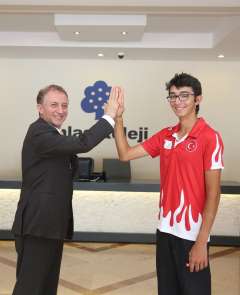 Eski mezunları Mete Gazoz'u tebrik eden İhlas Eğitim Kurumları Genel Müdürü Bedri Yeltekin, dünya çapında bir sporcunun kendi okullarından mezun olduğu için mutlu olduklarını söyledi.