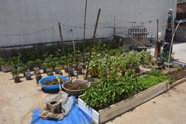 İlçenin Dicle mahallesinde yaşayan Faik Topal, 3 ay boyunca çöplerden biriktirdiği atık malzemelerle 2 katlı evinin çatısında, organik sebze ve bazı meyveleri yetiştiriyor.