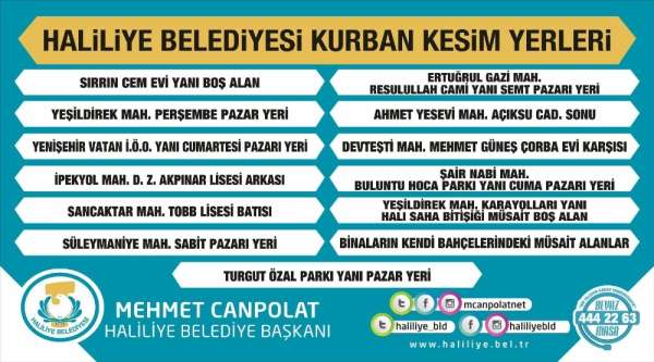Haliliye Belediyesi yaklaşan Kurban Bayramı'nda öncesi ve bayramda vatandaşların mağduriyet yaşamaması adına ilçede kurban satış ve kesim yerlerini belirledi.