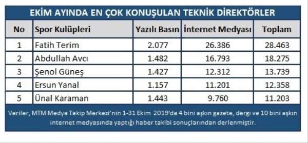 Ekim ayında 29 bin 463 habere konu olan Fatih Terim, en çok konuşulan teknik direktörler sıralamasında zirvede yer aldı.