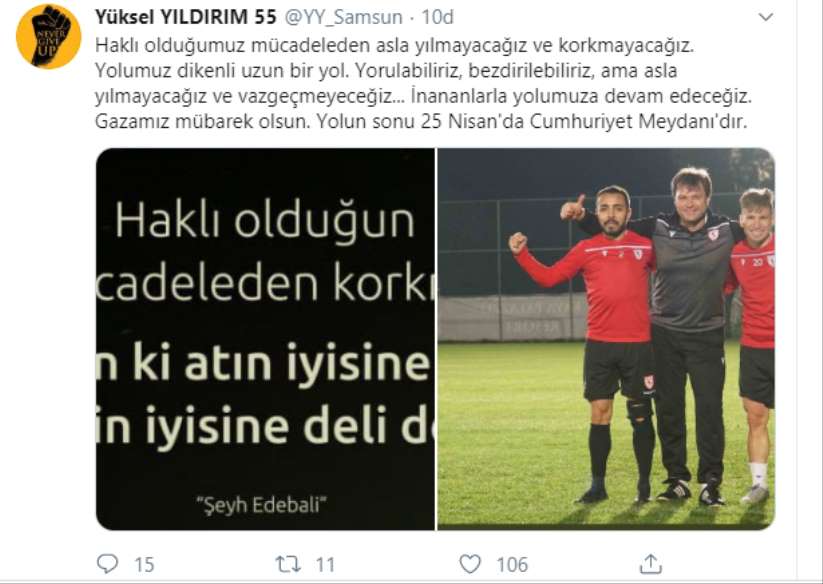Sosyal medya hesabı üzerinden sık sıkSamsunspor'a dair paylaşımlar ve açıklamalarda bulunan Yüksel Yıldırım, resmi twitter hesabı üzerinden , '' İnananlarla yolumuza devam edeceğiz'' açıklamalarında bulundu.