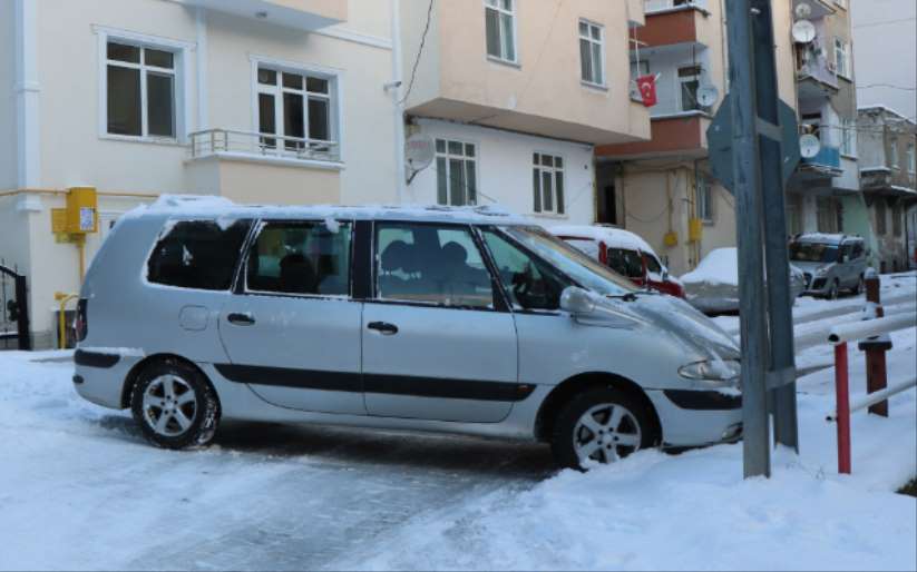 Cedit Mahallesi'nde bir hafif ticari bir araç, rampa aşağı inerken kontrolden çıktı. Buzdan kayan araç aydınlatma direğine çarparak durabildi.