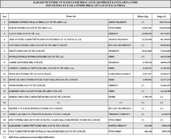 Karadeniz Fındık ve Mamulleri İhracatçıları Birliği (KFMİB) 2020 yılında fındık ihracatında ilk 20 sırada yer alan firmaları açıkladı. Oltan Gıda'yı satın almasıyla Türkiye'nin fındık ihracatında ilk sıraya yerleşen Ferrero, 2020 yılındaki 351 milyon 974 bin dolarlık fındık ihracatı ile yine ilk sırayı aldı. Listede Giresun'da faaliyet gösteren 6