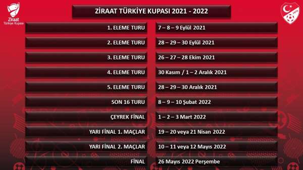 Türkiye Futbol Federasyonu'nun (TFF) resmi internet sitesinden yaptığı açıklamada, '2021 - 2022 sezonu Ziraat Türkiye Kupası maçlarının tarihleri açıklandı. Yapılan planlamaya göre Ziraat Türkiye Kupası'nda mücadele 7, 8 ve 9 Eylül'de oynanacak 1. Eleme Turu maçları ile başlayacak. Yarı finaller hariç tek maç eleme usulüne göre oynanacak Ziraat Türkiye Kupası'nda 26 Mayıs 2022'de yapılacak final müsabakasının yeri ve stadyumu daha sonra ilan edilecek' denildi.