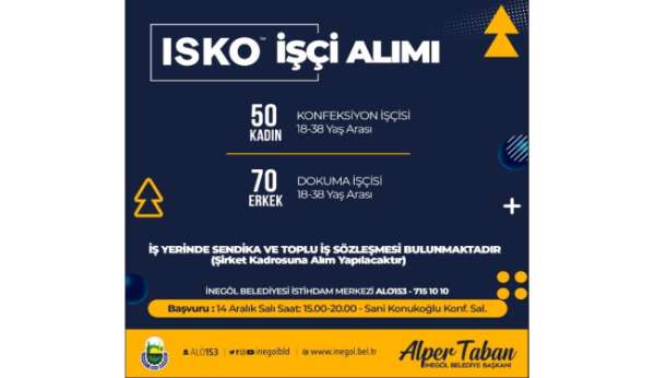 İnegöl Belediyesi İstihdam Merkezinden yapılan açıklamada, İnegöl Organize Sanayi Bölgesinde üretimini sürdüren İSKO tekstil firmasında çalışmak üzere personel alımı yapılacağı duyuruldu. Açıklamada şu ifadelere yer verildi: