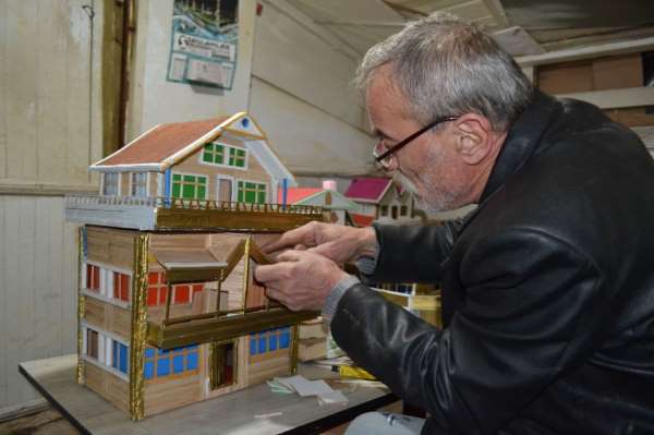 Maket ev yaparken zamanın nasıl geçtiğini anlayamadığını belirten Yıldız, 'Emekli olduktan sonra boşlukta kalmamak için evimin yanındaki depoyu atölyeye dönüştürdüm. Burada sağdan soldan inşaatlardan bulduğum malzemelerle maket yapmaya başladım. Sunta, tahta çay karıştırıcıları, kibrit çöpleri, köpüklerden faydalandım. Başka tülü zaman geçmediği için bunlarla zamanımı değerlendirdim' dedi.