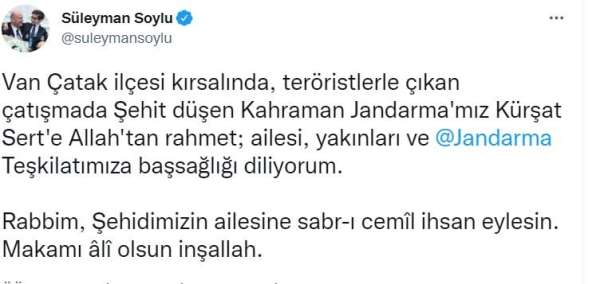 Bakan Soylu, sosyal medya hesabından yaptığı paylaşımda, 'Van Çatak ilçesi kırsalında teröristlerle çıkan çatışmada şehit düşen kahraman Jandarmamız Kürşat Sert'e Allah'tan rahmet; ailesi, yakınları ve Jandarma Teşkilatımıza başsağlığı diliyorum. Rabbim, şehidimizin ailesine sabr-ı cemil ihsan eylesin. Makamı âlî olsun inşallah' ifadelerini kullandı.