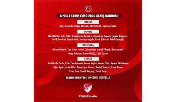 Almanya'nın ev sahipliğinde 14 Haziran-14 Temmuz tarihleri arasında düzenlenecek 2024 Avrupa Şampiyonası (EURO 2024) finallerine katılacak A Mili Takım'ın geniş kadrosu açıklandı. Teknik Direktör Vincenzo Montella tarafından belirlenen listede 35 futbolcu bulunuyor.