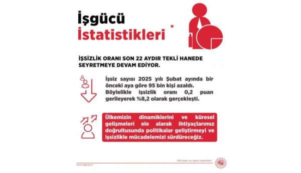 İşsizlik oranını son 22 aydır tekli hanede seyretmeye devam ettiğini söyleyen Işıkhan, '2025 yılı Şubat ayında bir önceki aya göre 95 bin kişi azalarak 0,2 puan, bir önceki yıla göre 202 bin kişi azalarak 0,4 puan gerileyen işsizlik oranı yüzde 8,2 olarak gerçekleşti. İstihdam edilenlerin sayısı 2025 yılı Şubat ayında bir önceki aya göre 149 bin kişi azalarak 32 milyon 314 bin kişi, istihdam oranı ise 0,3 puan azalarak yüzde 48,8 oldu. İşgücü, 2025 yılı Şubat ayında bir önceki aya göre 244 bin kişi azalarak 35 milyon 200 bin kişi, işgücüne katılma oranı ise 0,4 puan azalarak yüzde 53,2 olarak gerçekleşti' açıklamasında bulundu.