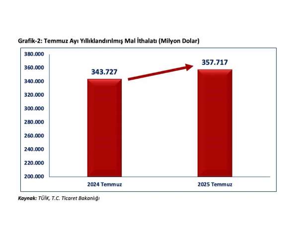 '2025 yılının Ocak-Temmuz döneminde ithalatımız geçen yılın aynı dönemine göre yüzde 6,9 artışla 212,2 milyar dolar olmuştur. 2025 Temmuz ayında yıllıklandırılmış ithalatımız bir önceki yılın aynı ayına göre 14,0 milyar dolar artarak 357,7 milyar dolar olarak gerçekleşmiştir. Dış ticaret açığımız 2025 Temmuz ayında yüzde 11,8 oranında azalarak 6,4 milyar dolar olarak gerçekleşmiştir. 2025 yılının Ocak-Temmuz döneminde dış ticaret açığımız geçen yılın aynı dönemine göre yüzde 12,2 artışla 55,9 milyar dolar olmuştur. Yıllıklandırılmış dış ticaret açığımız geçen yılın aynı ayına göre 6,0 milyar dolar artarak 88,3 milyar dolar olarak gerçekleşmiştir. AB-27'nin yıllıklandırılmış ithalatının hala yatay seyrini koruması, zayıf dış talep, yakın coğrafyamızda süregelen savaşlar, iç karışıklıklar ve gerilimler, tarife artışlarının getirdiği belirsizliğin devam etmesiyle beraber gelen zorlu rekabet koşullarına rağmen ihracatımızda artış devam etmektedir. Ticaret Bakanlığı olarak, ihracatçılarımıza sunduğumuz destekler, ticari diploması faaliyetlerimizin etkisiyle ihracatta elde edilen başarılar, üretim ve istihdam üzerinde olumlu sonuçlar vermektedir.'