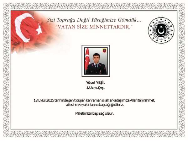 MSB tarafından Kütahya'da, yol kontrol devriyesi esnasında bir otomobilin çarpması sonucu şehit olan Jandarma Uzman Çavuş Yücel Şehit için başsağlığı mesajı yayımlandı. Mesajda, '13 Eylül 2025 tarihinde şehit düşen kahraman silah arkadaşımıza Allah'tan rahmet, ailesine ve yakınlarına başsağlığı dileriz. Milletimizin başı sağ olsun' ifadelerine yer verildi.