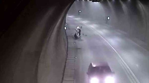 Ferhat Tüneli'nde sürücüsünün kontrolünü yitirdiği motosiklet, yolun sağındaki bordür taşları ile duvara çarpıp takla attı. Motosikletle yola savrulan sürücünün yardımına tünelden geçen diğer araç sürücüleri yetişti. Ayağa kalkan sürücü bir dakika sonra motosikletini yerden kaldırıp yoluna devam etti.