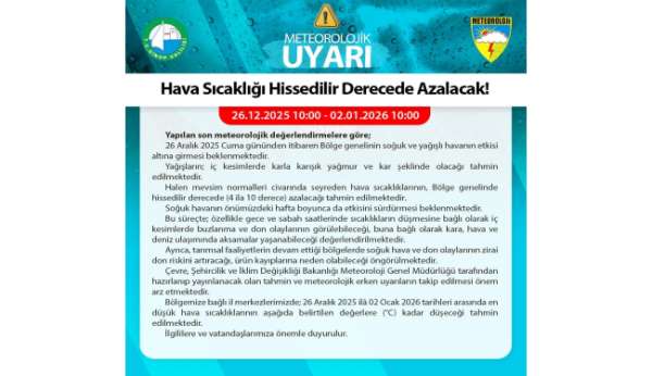 Meteoroloji Genel Müdürlüğü, 26 Aralık 2025 ile 2 Ocak 2026 tarihleri arasında bölgeye bağlı il merkezlerinde en düşük hava sıcaklıklarının eksi değerlere kadar düşebileceğini belirterek, yayımlanacak tahmin ve meteorolojik erken uyarıların yakından takip edilmesinin önem taşıdığını vurguladı.