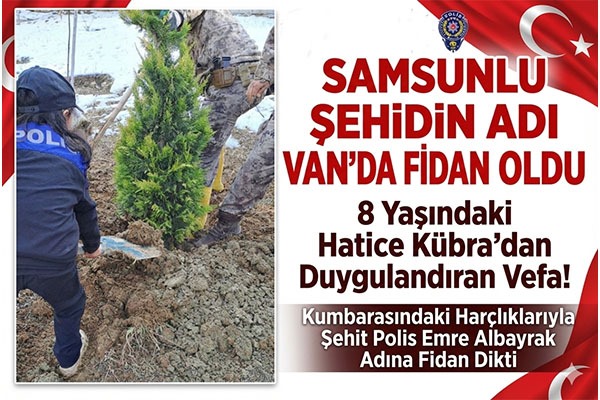 SAMSUN / VAN ? 8 Aralık tarihinde vatan savunmasında şehadet şerbetini içen Samsunlu kahraman Özel Harekat Polisi Emre Albayrak'ın aziz hatırası, Van'da dikilen bir fidanla ölümsüzleşti. Van'da yaşayan 8 yaşındaki ilkokul öğrencisi Hatice Kübra Karatekin, Samsunlu şehit abisi için unutulmayacak bir vefa örneği sergiledi.