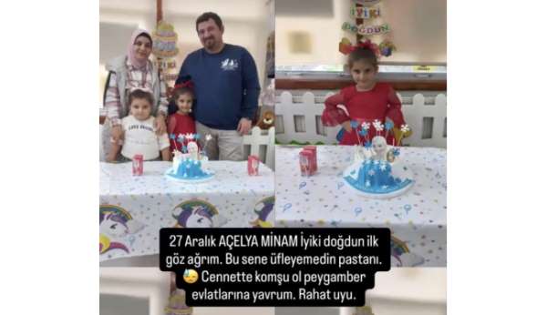 Samsun'un Canik ilçesinde, Lovelet AVM yanındaki akaryakıt istasyonunda 27 Nisan 2025 gecesi meydana gelen olayda, oto yıkama bölümünde aracını yıkayan Adem Kaya (35), kızları Açelya Mina (7) ve Ayla (5), toprak kayması sonucu göçük altında kalarak hayatlarını kaybetmiş, anne Çiğdem Kaya (31) ise yaralı olarak kurtulmuştu. Söz konusu davanın ilk duruşması 4 Aralık'ta Samsun 6. Ağır Ceza Mahkemesi'ne görülmeye başlandı. Akaryakıt istasyonu sahibi ve müdürünün yargılandığı dava ileri bir tarihe ertelenirken, hayatını kaybeden Açelya Mina Kaya yaşasaydı 8. doğum gününü kutlayacaktı. Acılı anne Çiğdem Kaya'nın sosyal paylaşım sitesinden eşi ve kızlarının da başında bulunduğu geçen yıl kutladıkları doğum günü kutlamasından fotoğraf ve üzerinde, '27 Aralık Açelya Minam iyiki doğdun ilk göz ağrım. Bu sene üfleyemedin pastanı. Cennette komşu ol peygamber evlatlarına yavrum. Rahat uyu' ve kızının mezarının yer aldığı 'Doyamadım kokuna' yazısı paylaşması yürekleri dağladı.