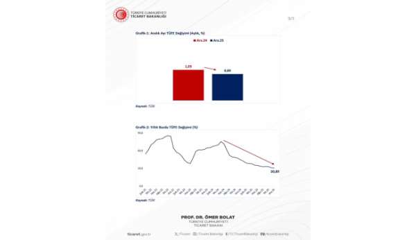Ticaret Bakanı Ömer Bolat, enflasyon rakamlarına ilişkin sosyal medya hesabından yaptığı değerlendirmede yıllık enflasyonun Aralık ayında yüzde 30,89'a gerileyerek son 49 ayın en düşük seviyesinde gerçekleştiğini duyurdu. Bolat, ekonomideki toparlanma sürecinin güçlenerek sürdüğünü dile getirdi. Bolat açıklamasında, 'Ekonomik büyüme, istihdam artışı, ihracat artışı, cari işlemlerdeki dengeli durum ve imalat PMI artışından sonra enflasyon oranındaki gerileme; 2025 yılında Türkiye ekonomisindeki toparlanma ve dengelenme sürecinin başarıyla devam ettiğini göstermektedir. Halkımızın alım gücü artacak ve refah seviyesinin iyileşmesine katkı yapacaktır' ifadelerini kullandı.