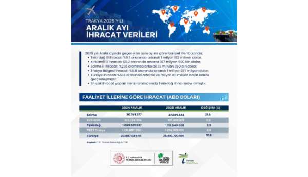 Açıklanan rakamlar, Trakya'da sanayi, tarım ve lojistik faaliyetlerinin yılın son ayında da dış ticarete güçlü katkı sunduğunu ortaya koyarken, özellikle Tekirdağ'ın ihracat hacmiyle bölge ekonomisindeki belirleyici rolünü sürdürdüğü değerlendirildi.