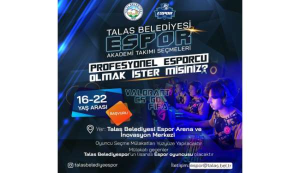 16-22 yaş arası gençlere yönelik düzenlenecek seçmelerde Valorant, CS GO ve FIFA branşlarında değerlendirmeler yapılacak. Seçmeler, Atatürk Bulvarı Dedeoğlu Parkı karşısındaki Talas Belediyesi Espor Arena ve İnovasyon Merkezi'nde gerçekleştirilecek. Oyuncu seçim mülakatları yüz yüze yapılacak olup, mülakatı başarıyla geçen adaylar Talas Belediyespor'un lisanslı e-spor oyuncusu olma hakkı kazanacak. Gençlerin teknolojiyle iç içe, disiplinli ve profesyonel bir spor anlayışıyla yetişmesini hedefleyen Talas Belediyesi, e-spor alanındaki bu çalışmasıyla hem yetenek keşfini hem de gençlere alternatif bir spor ve kariyer yolu sunmayı amaçlıyor. Başvuruda bulunmak isteyen adaylar; https://docs.google.com/forms/d/e/1FAIpQLSe5ZlZnvhIVUQA0BPAGvg4SwLLdLNNumXtOGGeO5fuEC0_Ctg/viewform?pli=1 adresinde yer alan başvuru formunu doldurarak sürece dahil olabiliyor.
