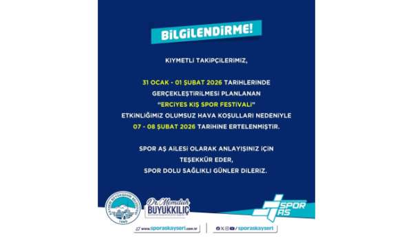 Spor A.Ş. tarafından yapılan paylaşımda, '31 Ocak - 01 Şubat 2026 tarihlerinde gerçekleştirilmesi planlanan 'Erciyes Kış Spor Festivali' etkinliğimiz olumsuz hava şartları nedeniyle 07-08 şubat 2026 tarihine ertelenmiştir. Spor A.Ş. ailesi olarak anlayışınız için teşekkür eder, spor dolu sağlıklı günler dileriz' ifadelerine yer verildi.