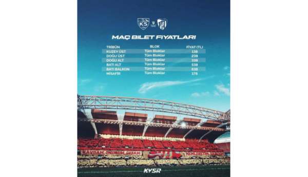 Süper Lig'in 21. Haftasında Kayserispor sahasında Kocaelispor'u ağırlayacak. Zorlu maçın bilet fiyatları belli oldu. Maçta en ucuz bilet 138 TL olurken, en yüksek bilet fiyatı ise 638 TL olarak açıklandı. Misafir seyircilerin 178 TL'den seyredeceği maç pazartesi günü saat 17.00'da oynanacak. Maçın bilet fiyatları şu şekilde: