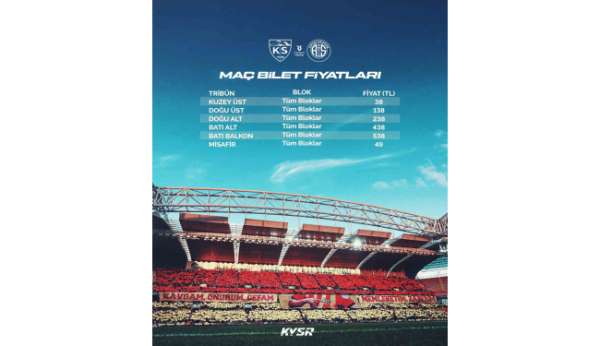 Süper Lig'in 23. Haftasında Kayserispor sahasında Antalyaspor'u ağırlayacak. Alt sıraları yakından ilgilendiren zorlu maçın bilet fiyatları belli oldu. Maçta en ucuz bilet 38 TL olurken, en yüksek bilet fiyatı ise 538 TL olarak açıklandı. Misafir takım seyircisinin 49 TL'den seyredeceği zorlu doksan dakika 22 Şubat Pazar günü saat 13.30'da oynanacak. Maçın bilet fiyatları şu şekilde; 'Kuzey Üst 38 TL, Doğu Üst 138 TL, Doğu Alt 238 TL, Batı Alt 438 TL, Batı Balkon 538 TL, Misafir 49 TL.'