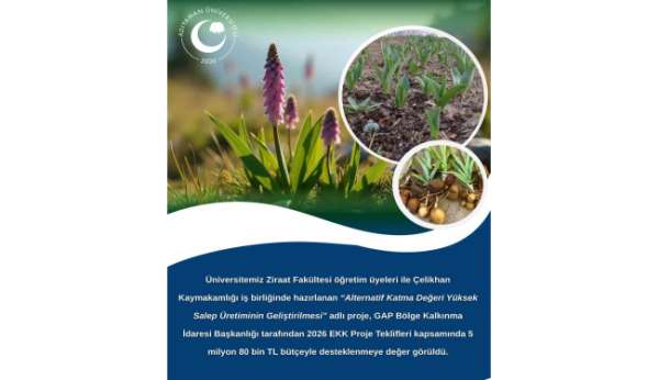 Çelikhan Kaymakamlığı ile Adıyaman Üniversitesi Ziraat Fakültesi öğretim üyelerinin iş birliğinde hazırlanan 'Alternatif Katma Değeri Yüksek Salep Üretiminin Geliştirilmesi' adlı proje, GAP Bölge Kalkınma İdaresi Başkanlığı tarafından 2026 EKK Proje Teklifleri kapsamında 5 milyon 80 bin TL bütçeyle desteklenmeye değer görüldü.