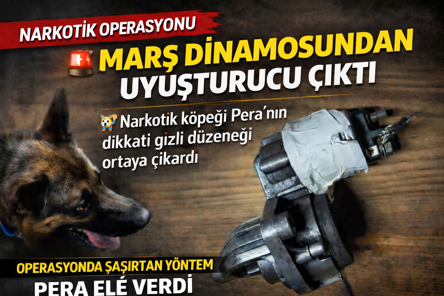 Kamyonetin kasasında bulunan çeşitli araç parçalarını tek tek kontrol eden Pera'nın marş dinamosu parçasına tepki vermesi üzerine ekipler şüpheli parçayı detaylı incelemeye aldı. Polis ekiplerince yerinde sökülerek açılan marş dinamosunun iç kısmında yapılan incelemede gizlenmiş halde 192,48 gram metamfetamin maddesi ele geçirildi. Uyuşturucu maddenin dikkat çekmemesi amacıyla araç parçasının içerisine zulalanarak saklandığı değerlendirildi. Kamyonette bulunan M.K. (49) ve B.A. (45) isimli şahıslar gözaltına alındı.