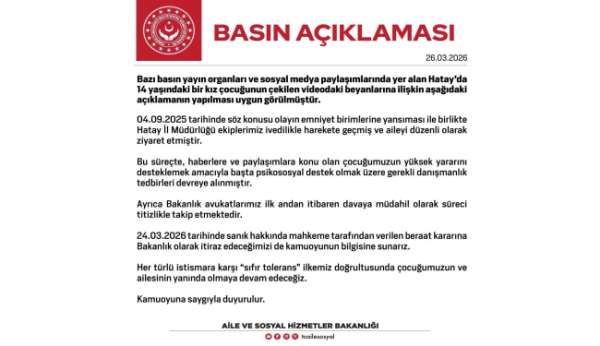 Bakanlık açıklamasında, 4 Eylül 2025 tarihinde söz konusu olayın emniyet birimlerine yansıması ile Hatay İl Müdürlüğü'nün harekete geçtiği ve aileyi düzenli olarak ziyaret ettiği belirtilerek 'Bu süreçte, haberlere ve paylaşımlara konu olan çocuğumuzun yüksek yararını desteklemek amacıyla başta psikososyal destek olmak üzere gerekli danışmanlık tedbirleri devreye alınmıştır. Ayrıca Bakanlık avukatlarımız ilk andan itibaren davaya müdahil olarak süreci titizlikle takip etmektedir. 24 Mart'ta sanık hakkında mahkeme tarafından verilen beraat kararına Bakanlık olarak itiraz edeceğimizi de kamuoyunun bilgisine sunarız. Her türlü istismara karşı 'sıfır tolerans' ilkemiz doğrultusunda çocuğumuzun ve ailesinin yanında olmaya devam edeceğiz' ifadeleri kullanıldı.