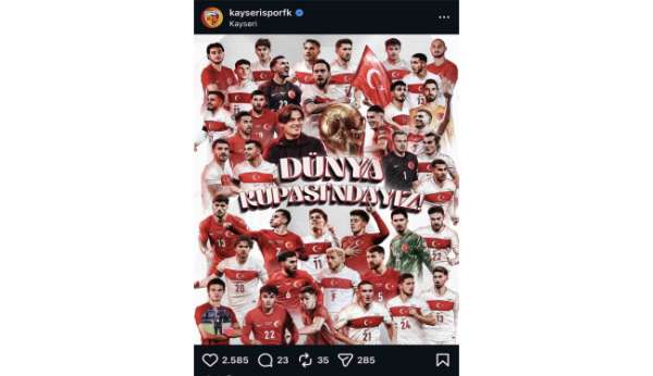 Kayserispor Kulübü'nün resmi sosyal medya hesaplarından yapılan paylaşımda 'Bin cihana değişmem şu öksüz Türklüğümü' yazan pankartlı fotoğrafı 'Dünya Kupasındayız' ifadeleri kullanıldı.