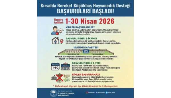 Küçükbaş hayvancılığın desteklenmesi amacıyla yürütülen proje çerçevesinde başvuruların 1-30 Nisan 2026 tarihleri arasında alınacağı bildirildi. Proje kapsamında, 18 yaş üstü Türkiye Cumhuriyeti vatandaşlarının başvuru yapabileceği belirtilirken, mevcut işletmesi bulunan (en fazla 105 dişi anaç hayvan) ya da işletmesi olmayan yetiştiricilerin de destekten yararlanabileceği ifade edildi. Başvuru şartları arasında her haneden yalnızca bir kişinin başvurabilmesi, başvuru sahibinin işletmenin bulunduğu il veya ilçede ikamet etmesi ve işletmenin yaklaşık 200 baş kapasiteye (100 anaç + 100 kuzu/oğlak) sahip olması gerektiği yer aldı.