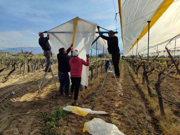 Manisa'nın üzüm üretimiyle ünlü Sarıgöl ilçesinde yeni sezon hazırlıkları başladı. Yapraklanmaya başlayan bağlar, dolu, yağmur ve soğuk havaya karşı koruma altına alınırken, üreticiler ürün kaybını önlemek için bağların üzerini dolu tülleriyle kapatıyor.