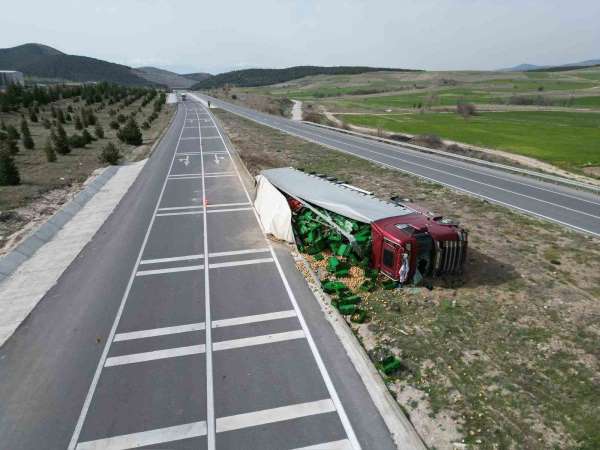 Kaza, Bolvadin ilçesi OSB Kavşağı'nda meydana geldi. Edinilen bilgilere göre, A.K., idaresindeki 42 V 4800 plakalı patates yüklü tır sürücüsünün henüz belirlenemeyen bir sebepten ötürü direksiyon hakimiyetini kaybetmesi sonucu kontrolden çıkarak refüje devrildi. Kazada sürücü ile birlikte K.K. ve M.E., yaralandı. Yaralılar kaza sonrası çevredekilerin haber vermesi üzerine olay yerine gelen ambulanslarla hastanelere kaldırıldı. Büyük çapta maddi hasarın meydana geldiği kazada, tırın dorsesinde kasalar içinde taşınan tonlarca patates ise çevreye dağıldı.
