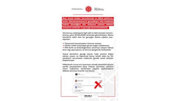 'Bazı sosyal medya mecralarında ve dijital platformlarda, Kahramanmaraş'ta gerçekleşen elim hadisenin failinin ölmediğine dair dolaşıma sokulan iddialar tamamen asılsızdır ve gerçeği yansıtmamaktadır. Söz konusu saldırganla ilgili adli ve tıbbi süreçler tamamlanmış; şahıs 16.04.2026 tarihinde gömülmüştür. Resmi kayıtlarla sabit olan bu gerçeğin aksine yapılan paylaşımlar; toplumsal hassasiyetleri istismar etmeyi, devlet-millet arasındaki güven bağını zedelemeyi, milli birlik ve bütünlüğümüzü sarsmayı isteyen bilinçli birer algı operasyonu ve kara propaganda faaliyetidir. Hukuk devletinin gereği olarak, halkı yanıltıcı bilgiyi alenen yayan ve toplumsal barışı tehdit eden bu tür içeriklerin sorumluları hakkında gerekli yasal süreçler başlatılmıştır. Milletimizin huzurunu bozmaya yönelik dezenformasyon içerikli paylaşımlara karşı hassas olunması; yalnızca resmi makamlar tarafından yapılan açıklamaların dikkate alınması önemle rica olunur.'