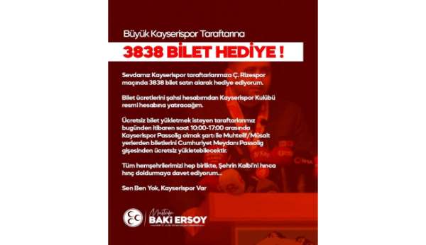 MHP Kayseri Milletvekili Baki Ersoy; Cumartesi günü oynanacak Kayserispor - Çaykur Rizespor maçı için sarı kırmızı taraftarlara bilet desteği sundu. 3838 bilet hediye edeceğini açıklayan MHP Kayseri milletvekili Baki Ersoy, 'Sevdamız Kayserispor taraftarlarımıza Ç. Rizespor maçında 3838 bilet satın alarak hediye ediyorum. Bilet ücretlerini şahsi hesabımdan Kayserispor Kulübü resmi hesabına yatıracağım. Ücretsiz bilet yükletmek isteyen taraftarlarımız Kayserispor Passolig olmak şartı ile muhtelif/müsait yerlerden biletlerini Cumhuriyet Meydanı Passolig gişesinden ücretsiz yükletebilecektir. Tüm hemşehrilerimizi hep birlikte, Şehrin Kalbi'ni hınca hınç doldurmaya davet ediyorum' dedi.
