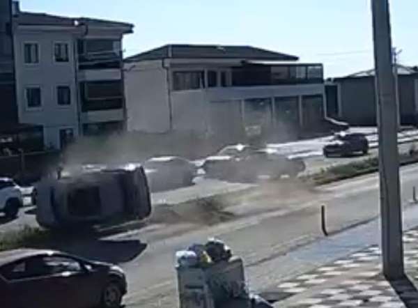 Tekirdağ Çorlu'da park halindeyken seyir haline geçen bir otomobille çarpışan SUV araç, 25 metre boyunca taklalar attı. Kazada 2'si çocuk 5 kişi yaralandı.