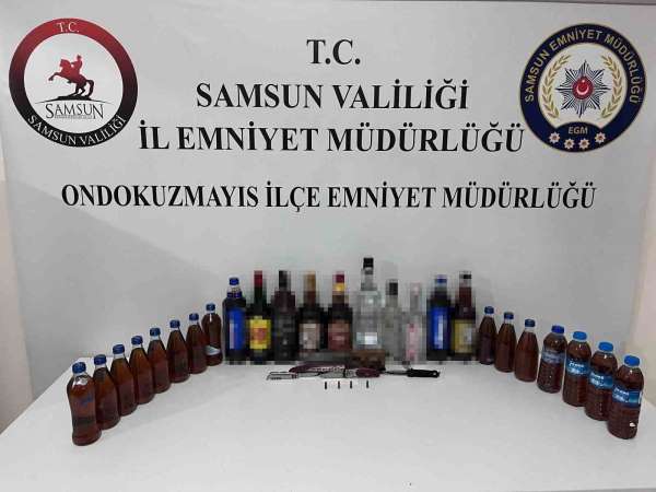 Samsun'un 19 Mayıs ilçesinde yapılan denetimde 1.64 promil alkollü olduğu belirlenen sürücünün aracından şişeler içinde el yapımı sahte içki, bıçak ve fişek ele geçirildi.