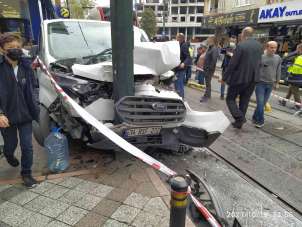Tramvay yolundan giden servisin direğe çarptığı kaza araç kamerasına yansıdı